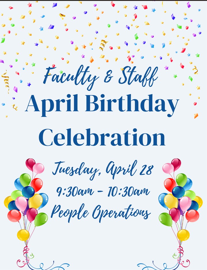 Stop by the People Operations office on Tuesday, April 28, between 9:30am – 10:30am, to celebrate our April birthdays.