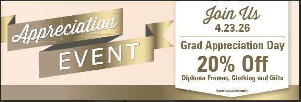 Get your diploma frames for 20% off. This will be the last opportunity before graduation to save on frames. April 23, 2026 only.