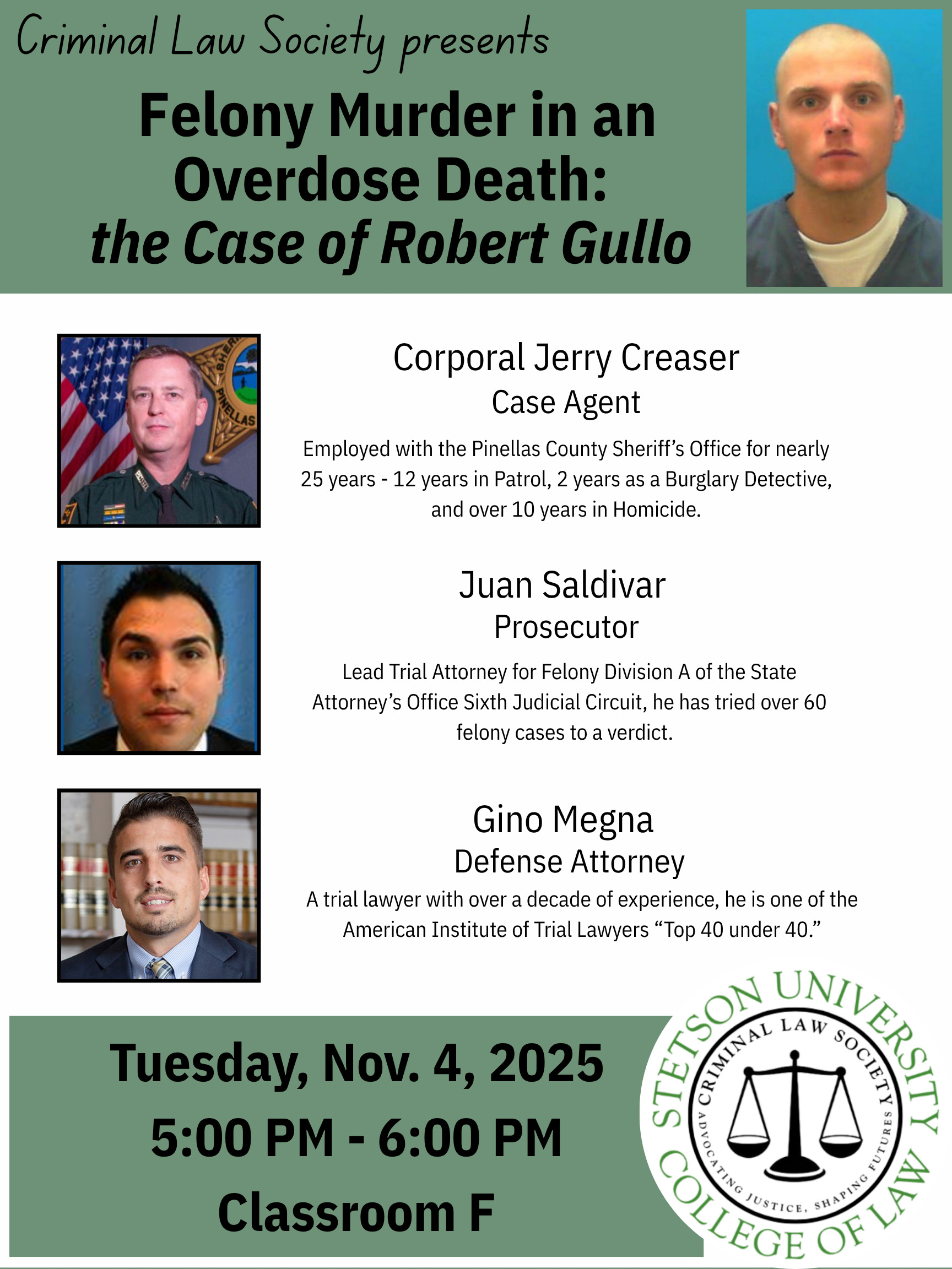 The Criminal Law Society presents Felony Murder in an Overdose Death: The Case of Robert Gullo on Tuesday, November 4, 5pm-6pm, in Classroom F.
