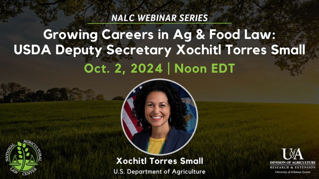 October 2 from 12-1 EST, USDA Deputy Secretary Xochitl Torres Small will present a National Agricultural Law Center (NALC) “Growing Careers” webinar (free of charge). The webinar is designed for students, faculty and other student mentors interested in issues and careers in agricultural and food law and is part of the NALC Ag & Food Law Bridges Initiative. Deputy Secretary Torres Small will discuss her background, path to and through law school, how her being an attorney factors into the various unique positions she has held and offer career and professional advice. Among her many accomplishments, Deputy Secretary Torres Small is an attorney, former member of Congress, and former USDA Undersecretary for Rural Development. LinkedIn Event for webinar available here.