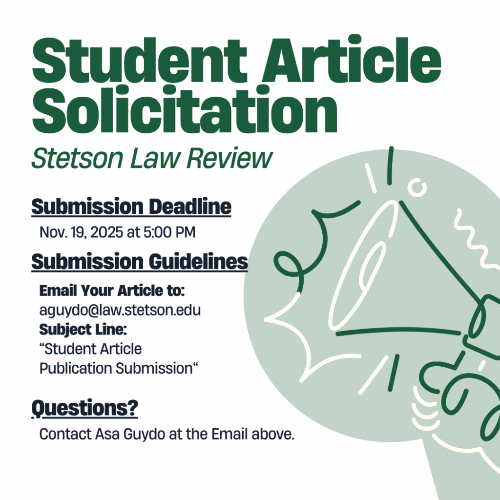 Stetson Law Review is looking for student articles to publish in its forthcoming issues! This is an opportunity to submit your completed student articles to Stetson Law Review’s Student Article Publication Committee, which reviews and selects student article submissions for publication. Student articles or manuscripts written for a seminar class, an independent research project, or a law review writing credit are all eligible for submission. Though works of any length are eligible, please keep in mind that submissions less than thirty pages or lacking compliance with relevant citation manuals will typically not be selected for publication. If you are interested, please send your completed student articles to [email protected] with the subject line “Student Article Publication Submission.” The deadline for submission is November 19th at 11:59pm. We encourage you to capitalize on this amazing opportunity to seek publication!
