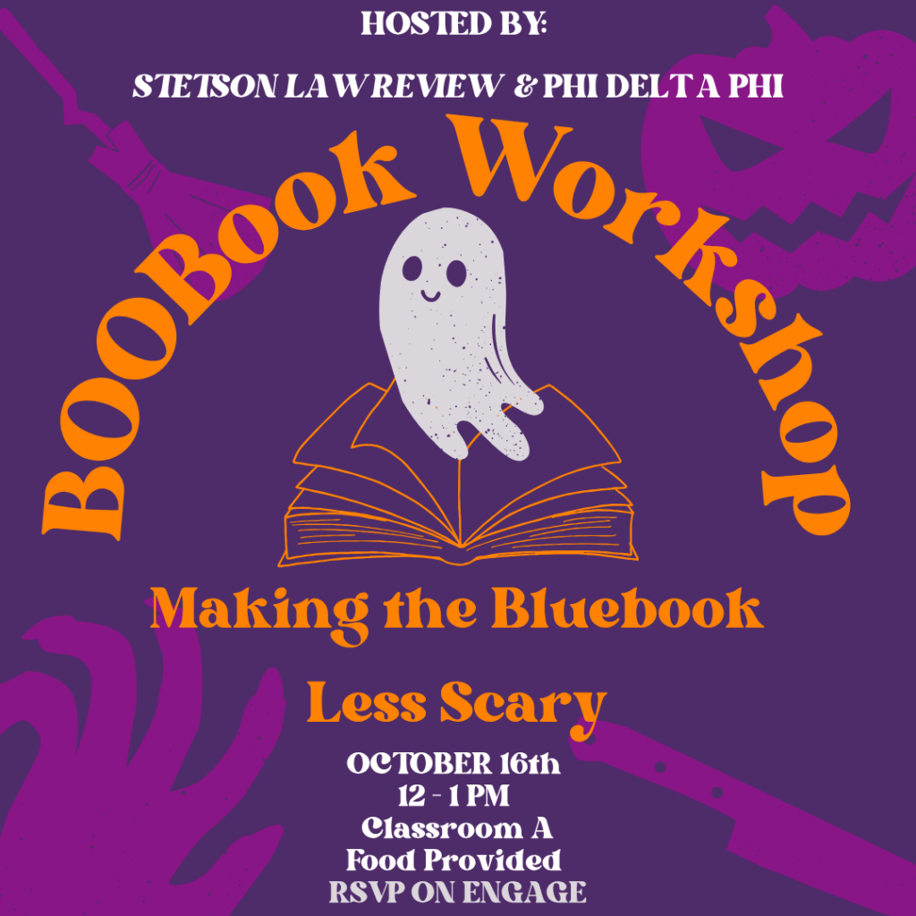 No need to be afraid of the Bluebook rules; join Stetson Law Review and Phi Delta Phi at the “Boo” Book Workshop, where participants will learn about Bluebook rules and major changes in the 22nd edition. This workshop will be very beneficial for those who plan on joining any journals or have upcoming writing assignments. This event will take place on Thursday, October 16, 2025, from 12:00-1:00 PM in Classroom A. Food will be provided.