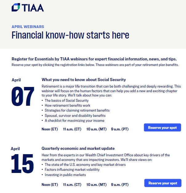 Check out the upcoming webinars TIAA is offering too –