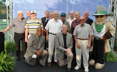 A dozen Stetson University football players from the 1940s and ’50s and a young recruit for next year’s return of Hatter Football were special guests at the ceremonial groundbreaking for the new Athletics Complex being built on the northeast side of campus.