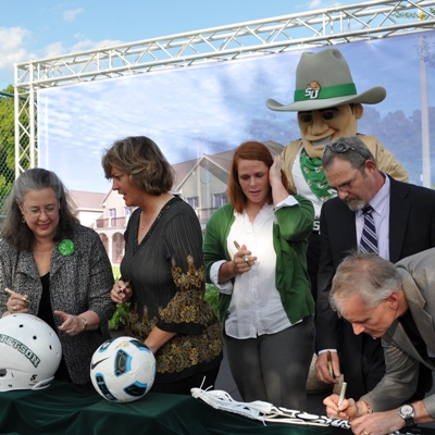 Since construction is already well under way, and to signify the joint use of the new complex by Men’s and Women’s Soccer, Football and Women’s Lacrosse, attendees were invited to sign a lacrosse stick, a football helmet and a soccer ball that will be displayed in the new Field House.