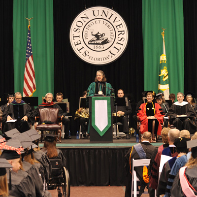 Stetson President Wendy B. Libby will give the “charge” at both ceremonies – a tradition where the president places a duty and responsibility upon the graduates. She will confer the degrees for 281 students who will receive graduate degrees and 504 undergraduates who will receive bachelor’s degrees. Spring Commencement includes all graduates who completed degree requirements in July 2011, December 2011 and May 2012.