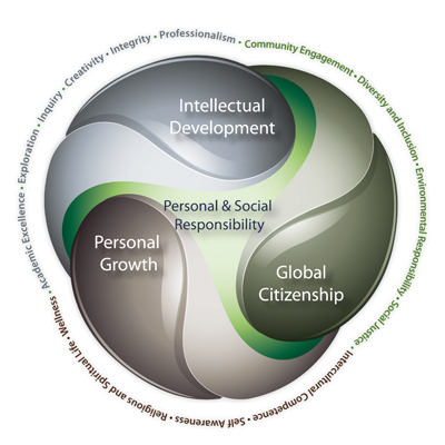 The revised and renewed values statement is organized around three core values: Personal Growth, Intellectual Development and Global Citizenship. The system formed by these three core values places Personal and Social Responsibility at its center. The three core values are surrounded by more specific values of: Academic Excellence, Exploration, Inquiry, Creativity, Integrity, Professionalism, Community Engagement, Diversity and Inclusion, Environmental Responsibility, Social Justice, Intercultural Competence, Self Awareness, Religious and Spiritual Life and Wellness.