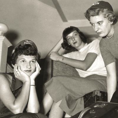 Whew! Your parents have just pulled away from your dorm, and you’ve started to meet your hallmates and roommates. As you try to squeeze your latest sweater set and saddle shoes into the tiny closets, you notice a letter stating there will be a hall meeting tonight to go over the rules and regulations of “Rat Week.” Rat what? Girls start whispering about little green beanies that must be worn for a week – something called a Rat Cap – and carrying books for the upperclassmen while having to obey their silly requests, or else. Or else what?