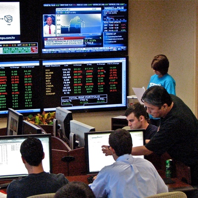 The trophy case proves the principle. The program has won 12 national championships in the last 11 years. Changes in portfolio investments are displayed in real time in the Trading Room, a constant reminder to students.
