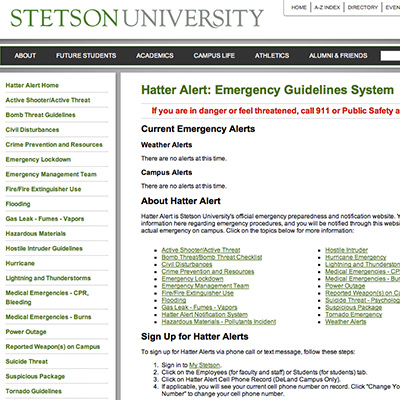 Hatter Alert is Stetson University’s official emergency preparedness and notification website. You will find important information here regarding emergency procedures, and you will be notified through this website in the event of an actual emergency on campus. It is imperative that everyone register for Hatter Alert in order to receive important communication about any campus emergency.