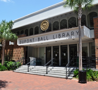 The Stetson library started in 1887 as a small book collection of 1,200 to 1,300 volumes on the second floor of the east wing of DeLand Hall. In 1889, the library officially became known as Sampson Library in honor of C.T. Sampson who contributed to purchasing the books in the library. In 1892, the library’s collection moved to the first floor of Elizabeth Hall, and in 1909, the collection moved into the Carnegie Library Building now known as Sampson Hall. The Carnegie Library Building was funded by the Andrew Carnegie Foundation and the collection jumped from 4,000 to 15,000 volumes. The duPont-Ball Library, named after a Stetson trustee Jessie Ball DuPont, opened in May 1964.