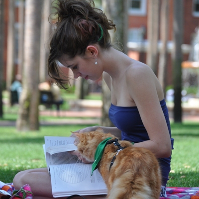 With the 2012-13 academic year winding down, the last day of classes is May 1. Commencement Day, May 11, is just over one month away, and Stetson’s DeLand campus is buzzing with end of year activities that will complete this academic year in fine style. (Molly Melin and her muse, Helios, pictured at right, study hard.)