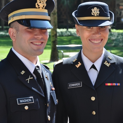 The double distinction marks the single-minded dedication of Caitlyn Amelia Edwards and Ronald Ethan Wagnon. Gold bars were pinned to their uniforms in a May 10 commissioning ceremony; their degrees were awarded May 11.