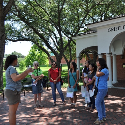 Upon arrival, the group was greeted by admissions recruiter, Meghan Moist, who held an information session on Stetson scholarships, organizations to get involved with, and other information. From there, student ambassador Chessy Armijos, (pictured) led the group on a tour of the campus and ended in the Commons inside the Carlton Union Building for a complimentary lunch. The students’ emotions gradually changed from nervous and shy at the beginning of their visit to enthusiastic and determined as they listened to stories, experiences and the university’s history, as related by Armijos and McIntosh.