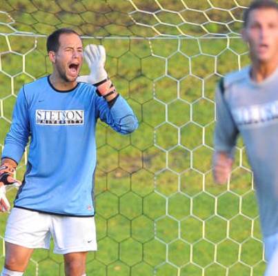 Stetson got on the board first on Sunday. Senior Raffaele Centofanti received a ball down the left side, took it to the endline, and crossed it right in front of the goal. A sprinting Gianluca Carbone timed it perfectly to one-time it past the Panther goalkeeper and give Stetson a 1-0 lead in the 12th minute of play. In the photo, Andreas Schnabl made four saves in the tie on Sunday.