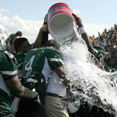 It may have taken a little over 22 hours from start to finish, but Stetson’s first victory in the modern era is officially in the books. (Head Coach Roger Hughes gets a gatorade shower from the Hatters following the victory. By: PhotosinMotion.net)