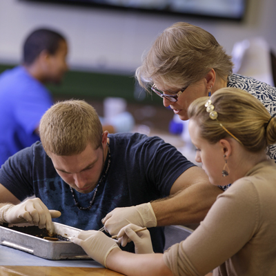“At Stetson, we take pride in being recognized as an academically rigorous institution that places a high value on global citizenship, personal growth and social responsibility,” said Stetson President Wendy B. Libby. “Stetson provides a personalized learning experience to each student, based on top quality faculty and focused on learning outcomes. We challenge our students to go beyond success – to become significant in their communities, nation and the world.” (Biology professor Cindy Bennington, Ph.D., is pictured, right, helping two Stetson students in the biology lab.)
