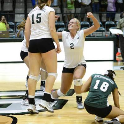 For the second time in less than 24 hours, the Stetson volleyball team triumphed in five sets, posting a 3-2 victory over visiting Jacksonville Saturday afternoon at the Edmunds Center. Pictured right, Kayla Weller celebrates after the Hatters completed a dramatic come-from-behind victory Friday night. Photo courtesy of David S. Williams. For this and all Hatter sports news, visit GoHatters.com.