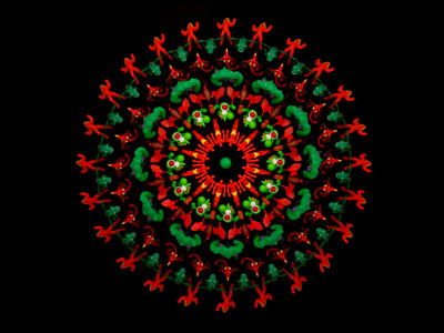 Having worked mainly in ceramics for 30 years, Gunderson is taking a decidedly different approach to his art with this installation. In this exhibit, Gunderson’s artworks are made up of pictures of toys. Gunderson completed his works by arranging thousands of toys collected from McDonald’s “Happy Meals”™ into mandala shapes, and then photographed them from an aerial viewpoint.