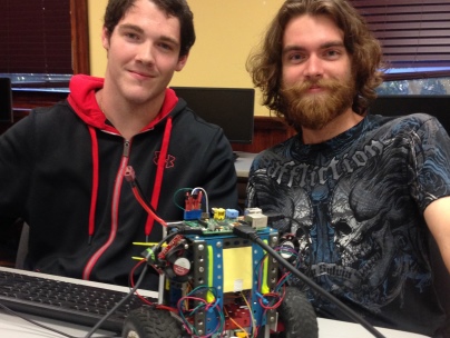 Computer science majors Kyle Campbell and Christian Micklisch, pictured left, developed the RapiBaBot at the Innovation House for Professor Hala ElAarag’s operating systems class.