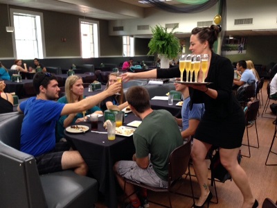 This year’s theme was HatterWood. The Commons portrayed an elegant, Oscar-styled party to celebrate Stetson’s biggest stars—its students. In the photo, right, Rebecca Williams, director of Catering, serves sparkling grape juice to the student clientele.