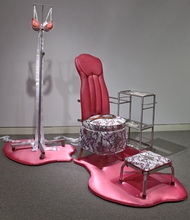 Taxus Swatch, featured top left: Ornamental upholstery used in the BC tableau that was created from breast cancer cells from pathology slides and specimens of pacific yew plant, source of chemotherapy drug paclitaxel (taxol). It also includes preventative purple flowers from common flax plant lignans (estrogen-like antioxidants); taxol molecules; and other plant-based compounds currently used or researched for breast-cancer treatment. BC-Full Side is featured below, right.