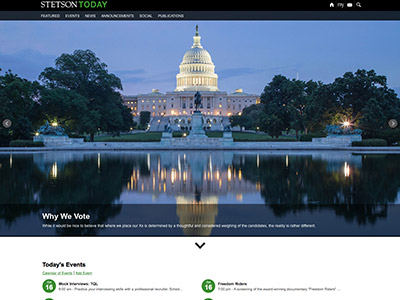 Now that Stetson Today is a successful mode of communication to the internal community, the goal is to broaden its day-to-day reach outside of this community to promote Stetson to a much wider audience. Adding features on topics of national interest will enhance the professionalism of the site, and enable media in other markets to become aware of Stetson spokespersons and their expertise on various topics.