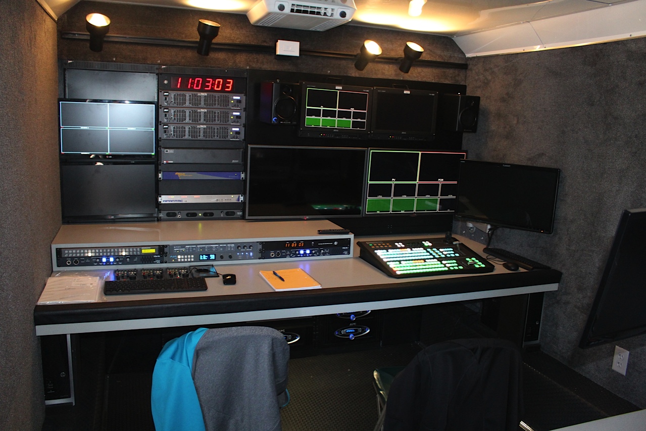 For the first time ever, with a trailer decked out with high-tech equipment, Stetson University will be able to broadcast events live. As a result, Stetson Athletics has partnered with the Atlantic Sun Conference and ESPN3 to broadcast every men and women’s basketball home game this season as part of the conference’s E3 On-Campus Initiative. (Pictured, left: production switcher and front bench.)