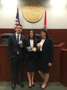 Stetson University College of Law students Alyssa Cory (pictured right), Ryan Hedstrom (pictured left) and Ashley Panaggio (center), swept the regional round of the New York City Bar’s 65th Annual National Moot Court Competition on Nov. 8 in Gainesville, Fla. Stetson’s team not only won the regional, but the team also won the best brief award and Panaggio won the best oralist award.