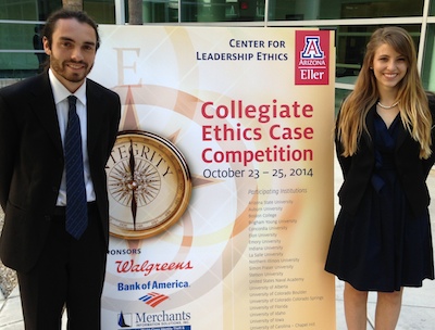 Beasley, Professor of Management, initiated Stetson’s participation in business ethics case competitions when he secured an invitation to the 2013 Arizona event and took two student members of the newly-formed Stetson Organization for Business Ethics (SOBE), Katie Kurtz ’14 and Ken DeMoya ’15, to represent Stetson in last year’s competition. DeMoya is the current president of SOBE. Beasley and Tichenor, who is Chair of the Management Department, intend to expand Stetson’s presence in this significant area of experiential learning by pursuing funding to send teams to other national competitions, including the International Business Ethics Case Competition, sponsored annually by the Ethics and Compliance Officer Association. Tichenor said of the 2014 event at the University of Arizona, “The outstanding performance of Emma and David on this national stage is both illustrative of the capability of our students and supportive of the core values of the University. Jim and I hope to give increasingly more students the opportunity to gain this kind of practical educational experience.”