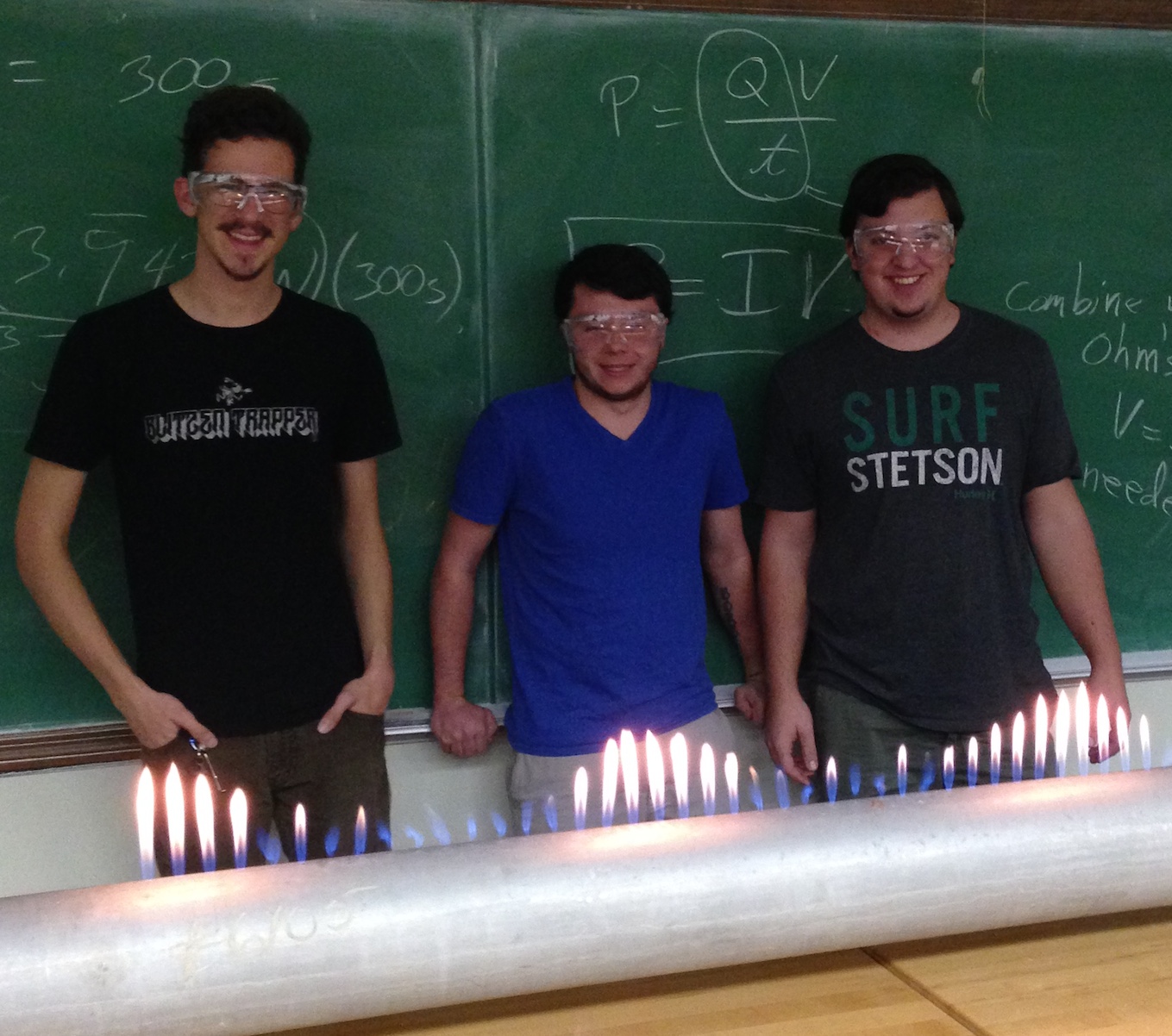 In Sage Science Center, students from the Society for Physics (Sigma Pi Sigma) will offer a spectacular display of physics experiments, including a demonstration of the wavelengths of sound, using a standing-wave flame tube; a Magdeburg Hemisphere vacuum tug-of war; and some of the dazzling effects of liquid nitrogen. Their advisor, Kevin Riggs, Ph.D., explains that the program is designed to show that “science can be both fun and educational.” (In photo, Stetson students, left to right, Stan Borrell, Jon Lockwood and Tyler Schulte work with a Rubens’ Flame Tube.)