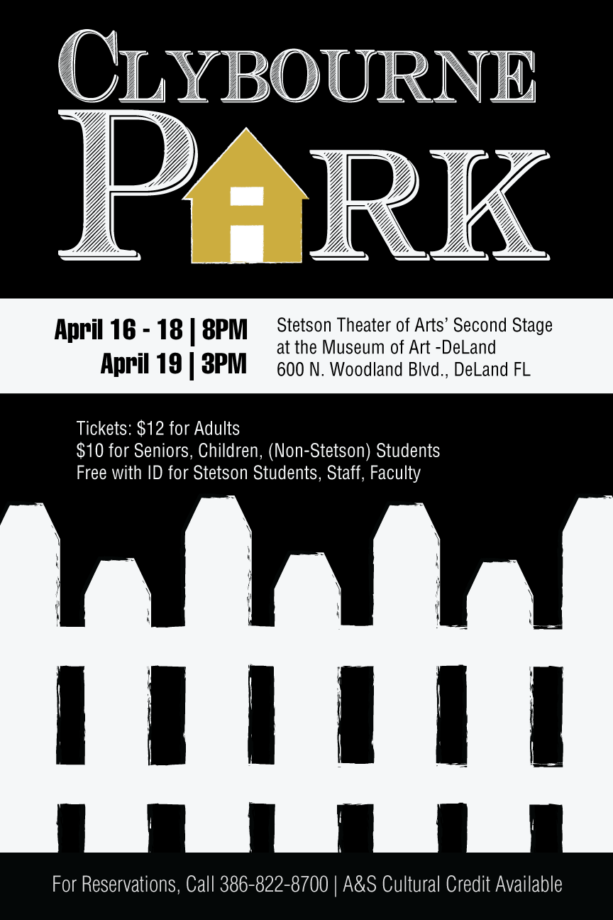 Stetson University presents Clybourne Park April 16-18, at 8 p.m. and April 19 at 3 p.m., in Stetson Theatre Arts’ “Second Stage” located inside the Museum of Art, 600 N. Woodland Blvd., adjacent to the DeLand campus.