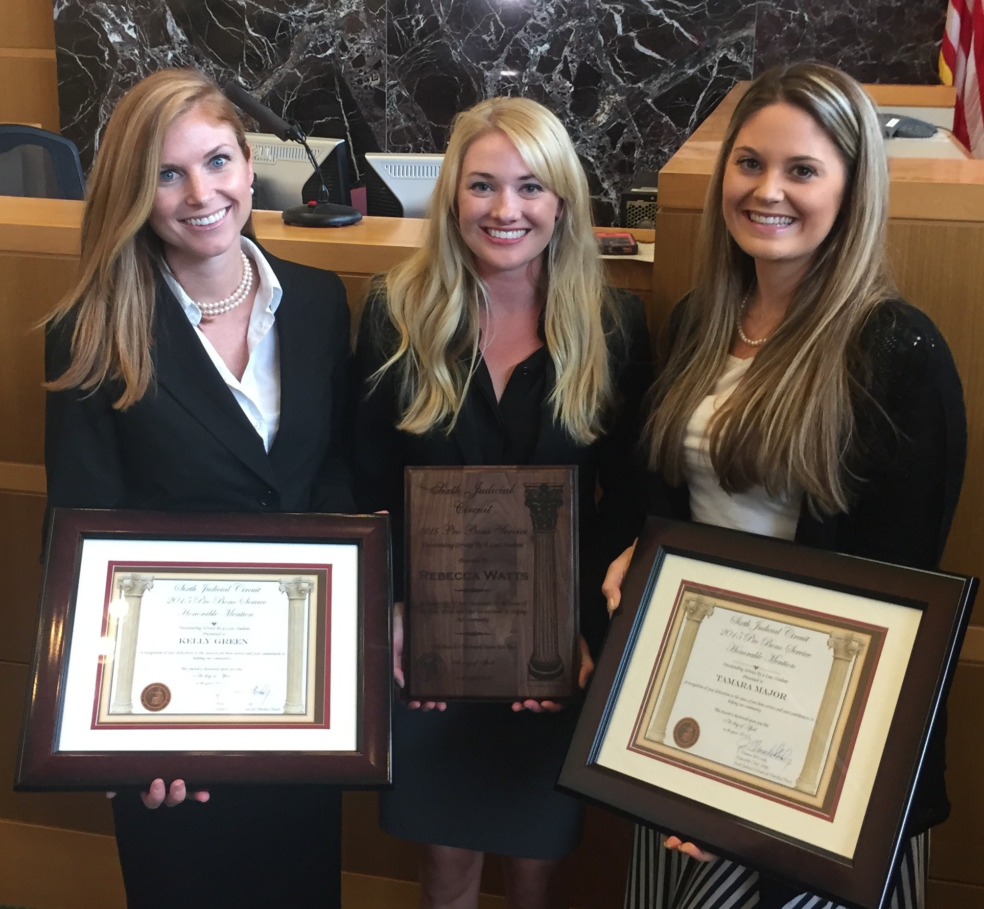 Stetson University College of Law student Rebecca Watts won the Law Student Pro Bono Award and students Tamara Major and Kelly Green received honorable mention from Florida’s Sixth Judicial Circuit for their commitment to creating pro bono service opportunities for students at Stetson.