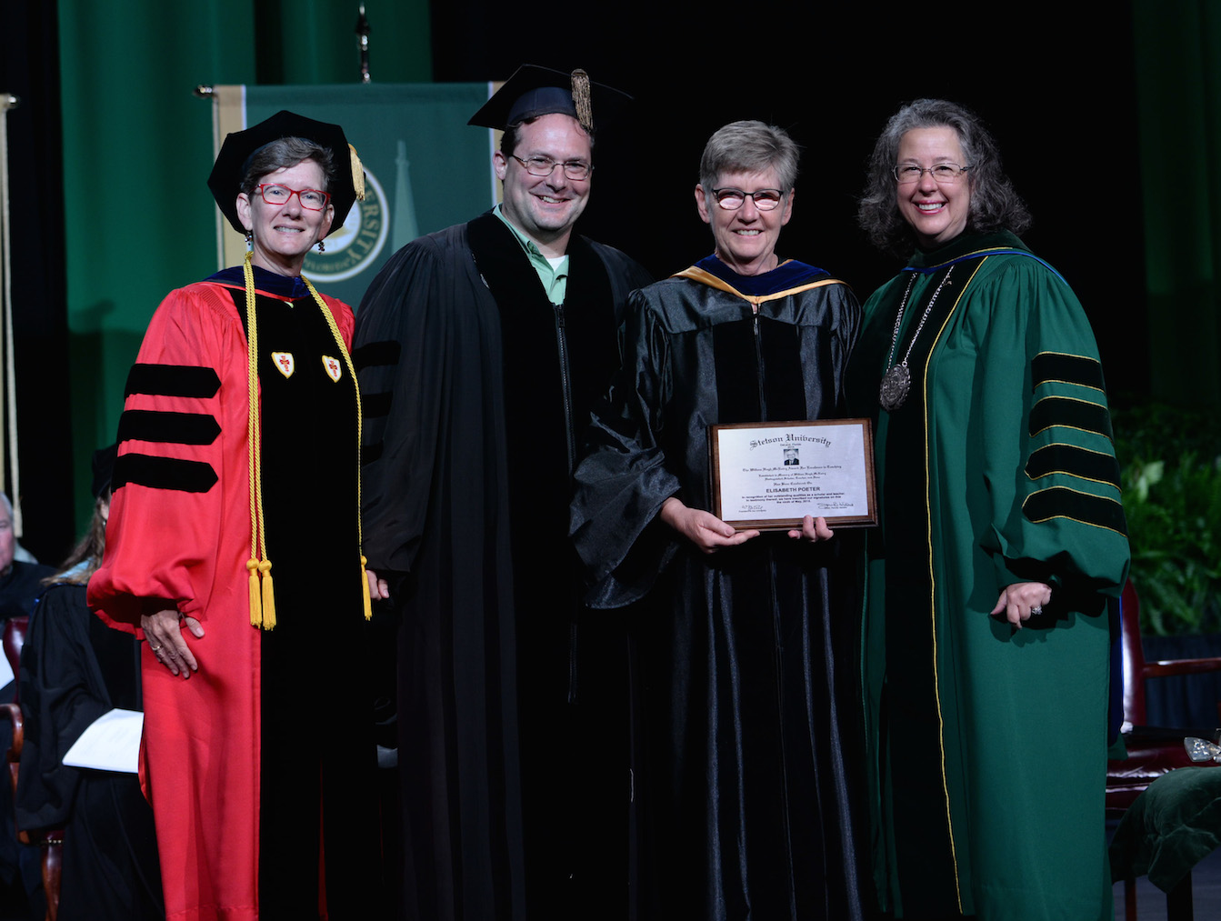 William Hugh McEniry Award for Excellence in Teaching is considered Stetson’s most prestigious award for faculty. It is awarded to a faculty member chosen by students and other faculty. Excellence in classroom teaching is the primary criterion, though other factors, such as intellectual growth, professional competency, academic activities outside the classroom, and service to students and the university as a whole may be considered. The recipient of this year’s McEniry Award is Elisabeth Poeter, Ph.D., associate professor of German. (Pictured l to r: Beth Paul, Eric Kurlander, Elisabeth Poeter, Wendy Libby.) The award was presented at the Saturday commencement ceremony by Eric Kurlander, Ph.D. , professor of history, and last year’s recipient of this award.