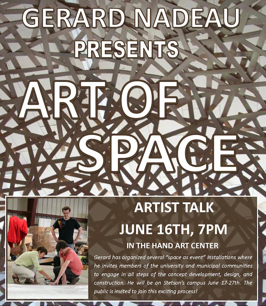 Artist and architect Gerard Nadeau will present a public lecture at Stetson University about his Art of Space installation on Tuesday, June 16, at 7 p.m. in the Hand Art Center, located at 139 East Michigan Avenue, DeLand. Sponsored in part by Stetson’s Artists and Lecturers Series, this event is open to the public, free of charge. Nadeau will remain on campus from June 16-27 and welcomes the community to join him in building an Art of Space installation on Stetson’s campus during this time.