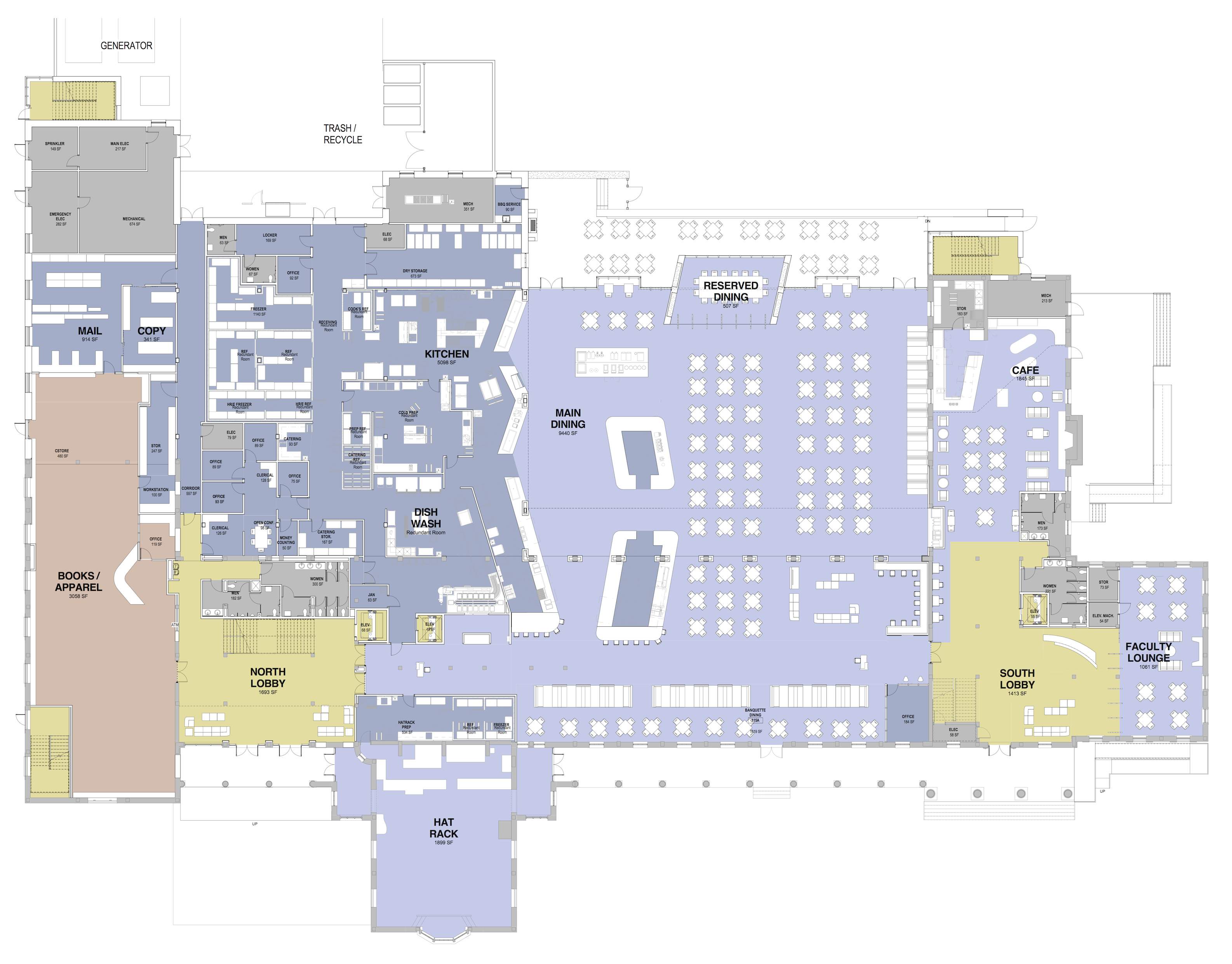 The CUB’s second floor will include a large student lounge and office space for the Student Government Association and student clubs and organizations, among other areas. Staff offices for those who partner or work with students also will be located there. The north wing of the building will contain a new retail center, while the east wing will have a patio dining area overlooking green space.