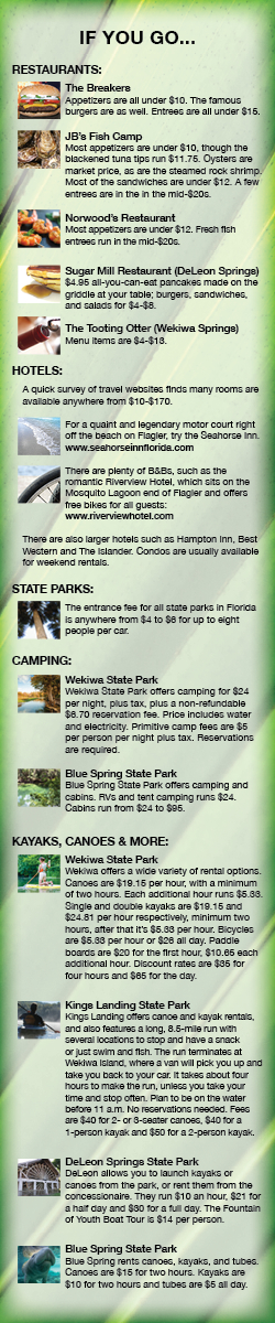 There’s the manatee-haven known as Blue Spring, less than 20 minutes down the road. Though Blue Spring is closed for swimming and water activities during the winter, it turns out that is when people love to visit and watch the manatees. Herds of them gather at Blue Spring to keep warm from mid-November until March. Another treat: After opening back up to swimmers in March, Blue Spring has a “firefly season” usually the first weeks of April, when thousands of fireflies light up the woods at dusk. The park allows day visitors stay late to see it.
