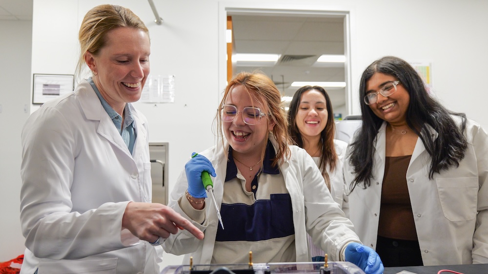 Kristine Dye, PhD, assistant professor of Health Sciences and Biology, works with students in her lab.