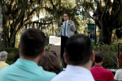 “I am particularly proud at how our students are modeling civil dialogue,” he said, pointing out a recent joint interview for Central Florida Public Media that involved the presidents of Stetson Democrats and College Republicans. The two students talked about their strong friendship and the importance of civil, non-violent conversation and action. “These were Stetson students!” he shouted.
