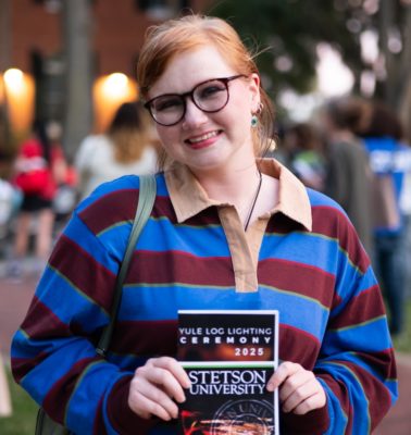 Kyra Sullivan, a senior majoring in both Communication and Media Studies and English, had never been to the ceremony. Aside from classes, she has juggled multiple jobs. This year, however, she was able to attend. “I’m excited to actually make it because I feel like it’s a really cool multi-religion thing,” Sullivan said. “It’s not Christmas; it’s not Hanukah; it’s not Kwanza. It’s just a winter event that everyone can participate in, and I think it’s really cool that [Stetson has] been doing it for so many years.”