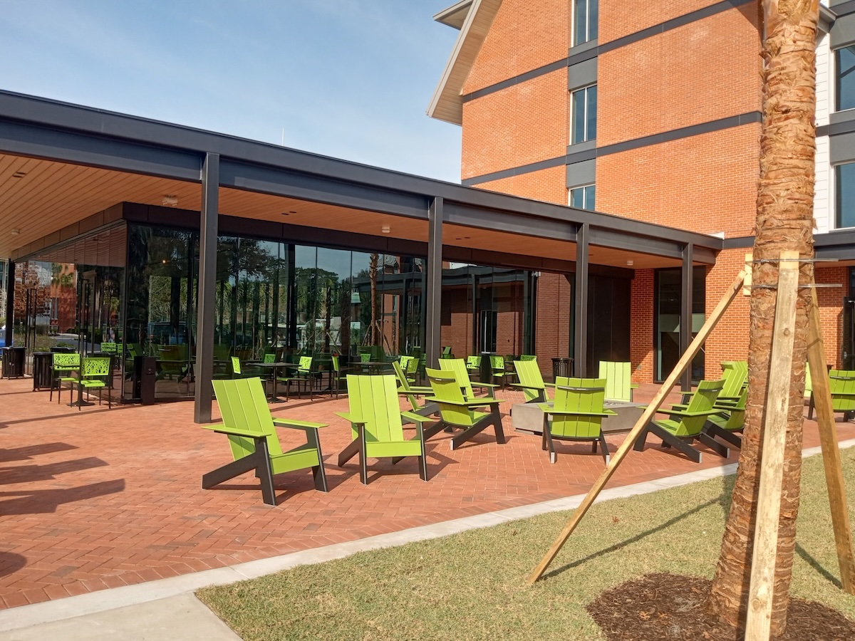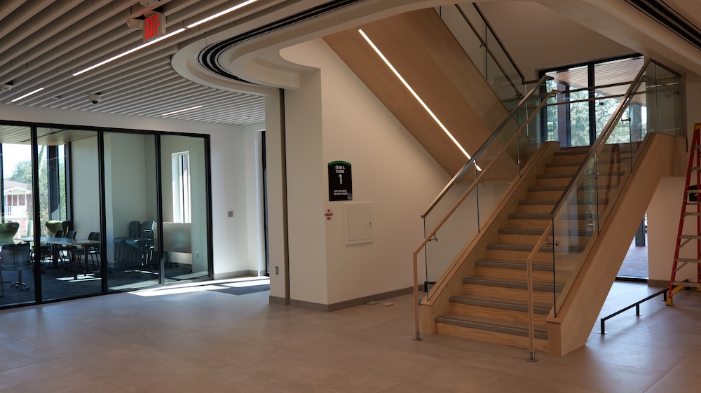 Scott Thacker, Stetson’s associate vice president of Facilities Management, pointed to the large community gathering space on the first floor of the building, which demonstrates “our purposeful effort to create space in this new building for all students on campus, including commuter students who now have another place they can come to study or hang out.” He noted that the outdoor spaces – the covered wrap-around porch, firepit, amphitheater, and ample other spaces to lounge and relax – “all speak to the thoughtful design, much of which resulted from feedback sessions with students during the design process.”