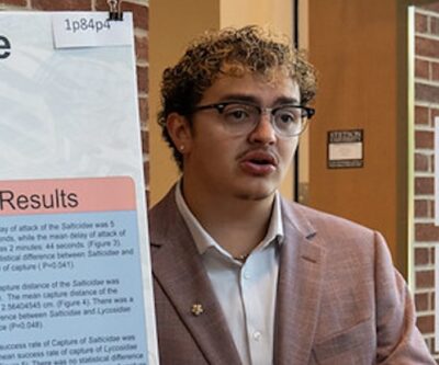 For example, there was senior Biology major Adrian Cerrud presenting “A Comparison of Hunting and Capture Behavior Between Lycosidae and Salticidae Spider Families” — research on hunting behavior and the potential translation to prosthetics for people.