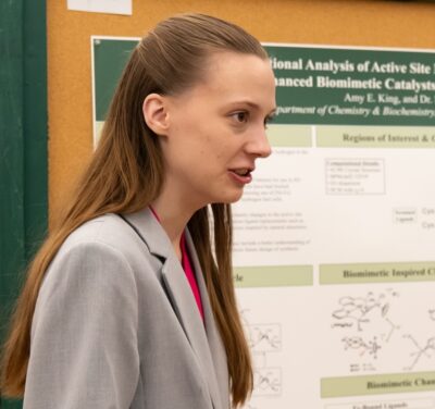 Sophomore Chemistry major Amy King was all smiles as she discussed her poster, “Computational Analysis of Active Site Modifications in [NiFe] Hydrogenase for Enhanced Biomimetic Catalysts.” While current green hydrogen production is limited by its use of expensive and rare platinum electrodes, her research computationally explored biomimetic modifications to the natural hydrogen catalyst [NiFe] Hydrogenase in hopes of supporting the development of an earth-abundant alternative to platinum.