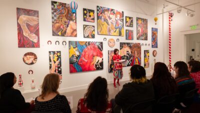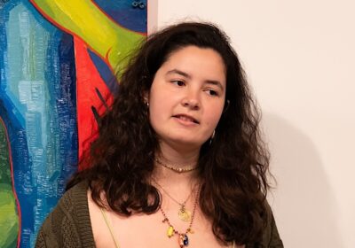 At the Hand Art Center, senior Studio Art major Maria Latour explained her work, “Fish Sermon,” an exploration of the “mysterium tremendum.” The phrase was coined by German theologian Rudolf Otto in reference to man’s experience of the spiritual, awe-inspiring and divine. Latour’s work drew parallels between underwater phenomena and mythology, philosophy and religion. In addition, the research was reflected in her brilliantly colorful art.