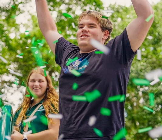 A brilliantly sunny April 11 day at Stetson turned out to be robustly spirited and productive, as the university showed off its campus to 228 prospective new students and 664 attendees in all during the second of two Hatter Saturdays. The buzz was distinct, starting early morning at an energetic Edmunds Center opening session. And the sounds were joyous. As is tradition, every time accepted students officially committed to become Hatters, they rang Stetson’s Victory Bell, accompanied by confetti streams and loud cheers.